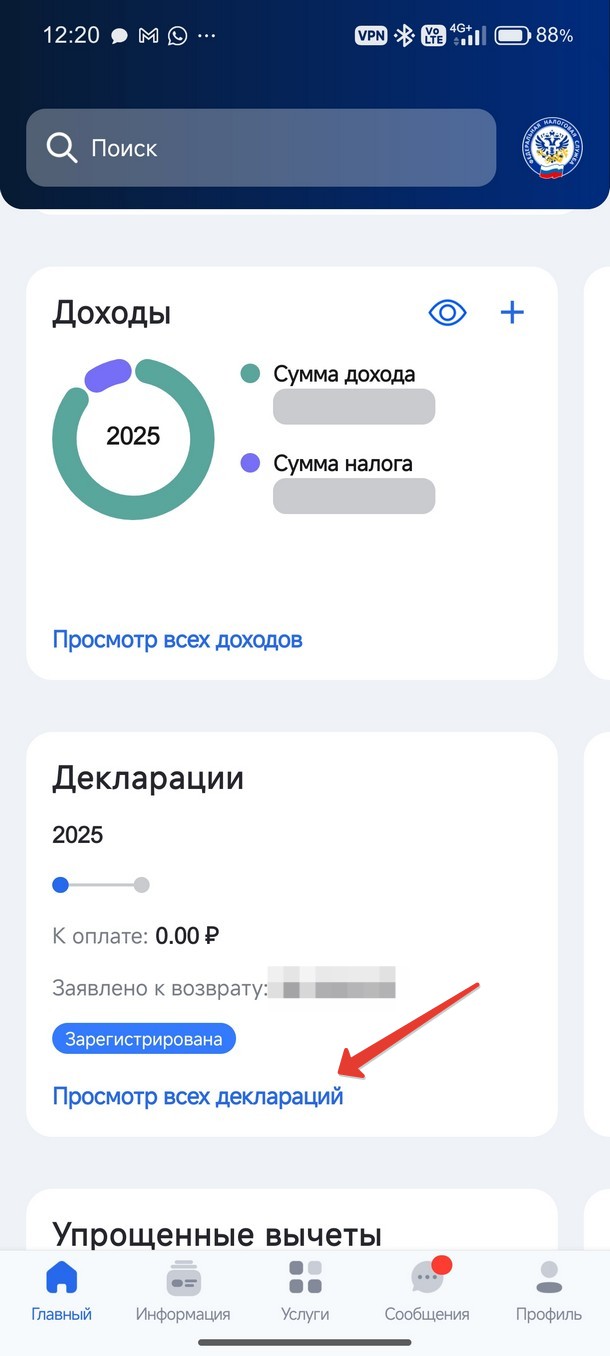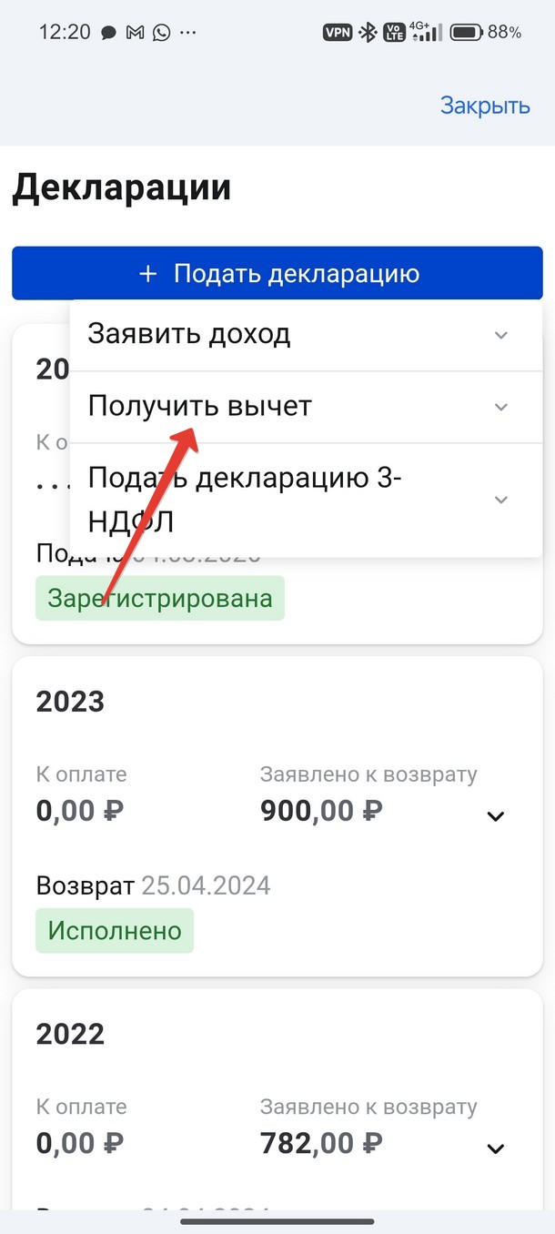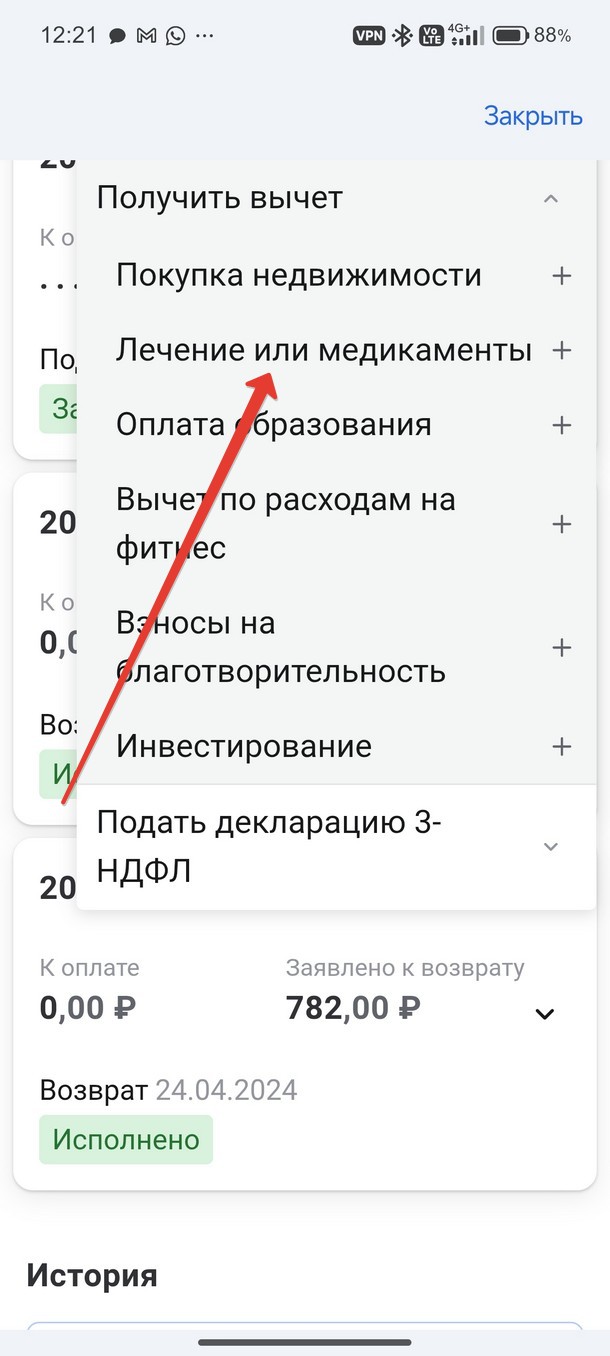 Выберите «Посмотр всех деклараций». Далее нажмите «Подать декларацию», «Получить вычет», «Лечение и медикаменты».