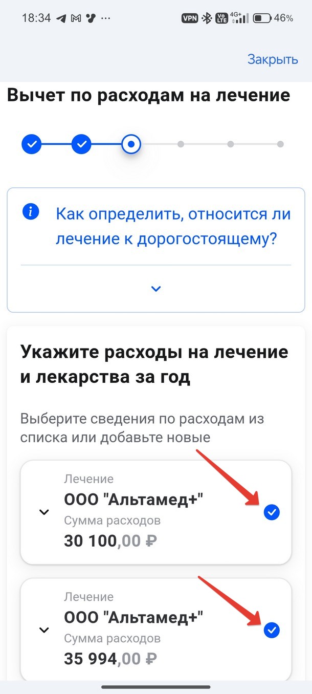Выберите год, за который подаете вычет. На следующем экране выберите вы увидите справки, которые ранее были отправлены в ФНС медицинским центром, выберите их. Далее необходимо ввести данные расчетного счета, куда будет проводится возмещение.