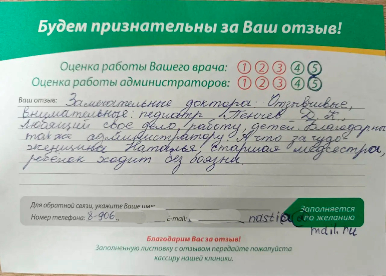 Замечательные доктора: Отзывчивые, внимательные: педиатр Пенчев Д.К., любящий свое дело, работу, детей. Благодарны также администратору. А что за чудо-женщина Наталья, старшая медсестра, ребёнок ходит без боязни.