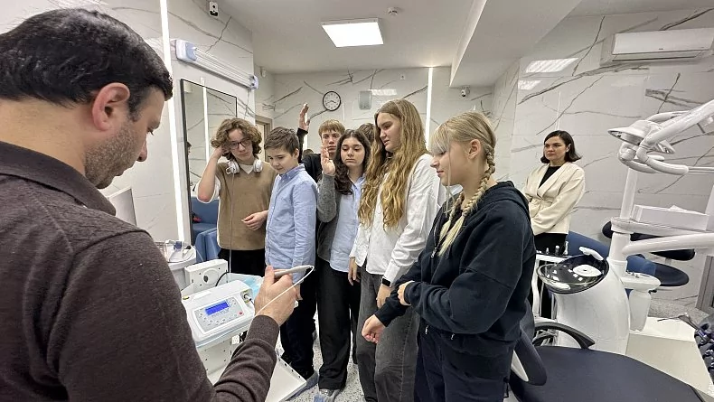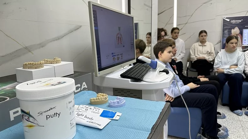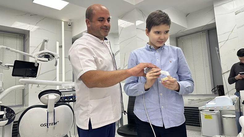 Затем ребята воочию увидели аппараты, как в фильмах будущего. Особенно их поразил интраоральный сканер – устройство, которое с помощью светового луча сканирует ротовую полость, и на экране компьютера появляется модель зубов. Его презентовал школьникам врач – стоматолог-ортопед с 15-летним стажем Гарик Арамаисович Арзуманян.