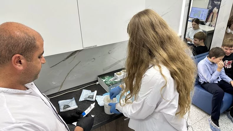 А после предложил всем желающим попробовать себя в роли врача и сделать слепки зубов из твердеющей пасты или построить модель зубов с помощью сканера (разумеется, «обследовав» лишь симулятор челюсти).