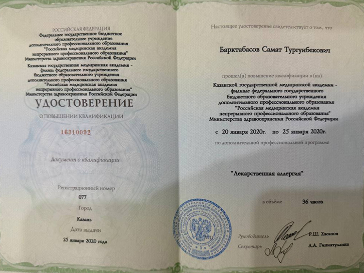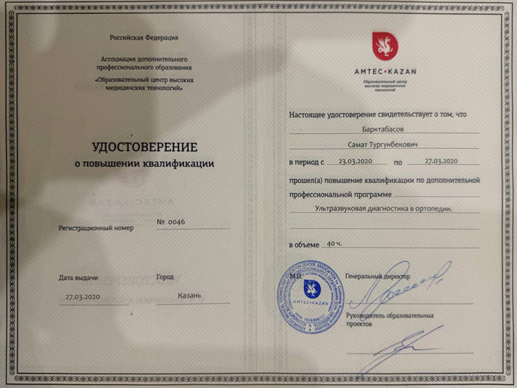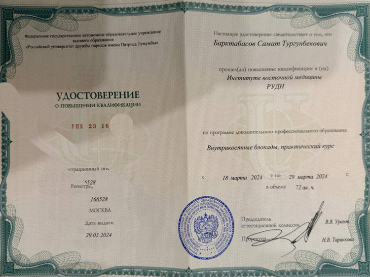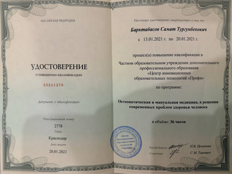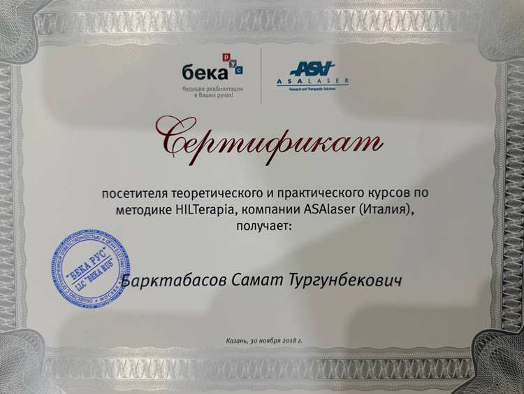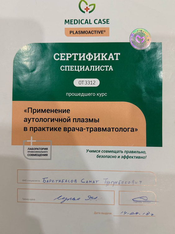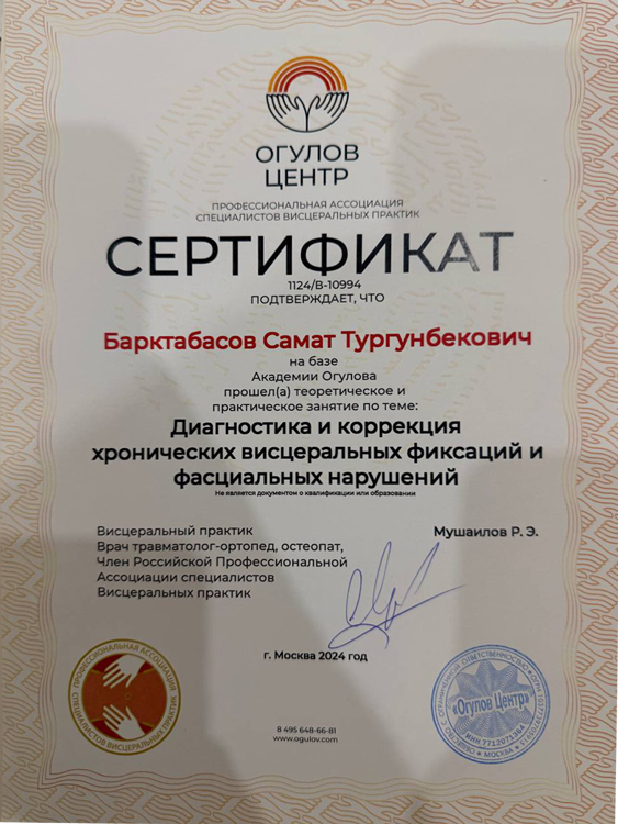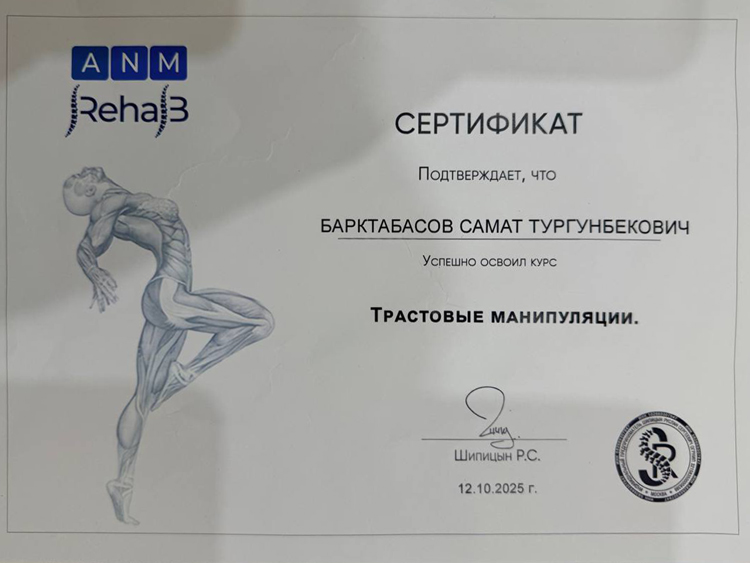 Самат Тургунбекович успешно специализируется на лечении любых заболеваний опорно-двигательного аппарата, заболеваниях, связанных с мышцами, связками, сухожилиями, хрящами. В ходе своих приемов доктор Барктабасов выстраивает комплексный план восстановления: убрать острый симптом (инъекции, блокады), восстановить биомеханику (мануальная терапия, коррекция стоп и осанки) и дать тканям ресурс для восстановления (ПРП, SVF-терапия).