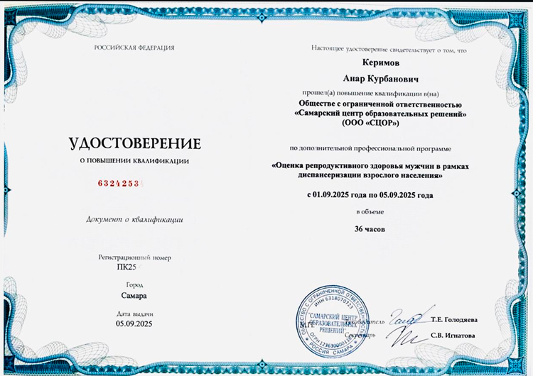 Анар Курбанович - врач более чем с 10-летним опытом работы в области урологии и андрологии, а также ультразвуковой диагностике. Глубокое понимание мужского здоровья, а также комплексный подход: сочетание урологии, андрологии и ультразвуковой диагностики позволяют доктору Керимову проводить точную диагностику и эффективное лечение. Накопленный опыт работы с широким спектром пациентов: от молодых мужчин и женщин до пожилых людей, позволяет Анару Курбановичу индивидуально подходить к каждому случаю.