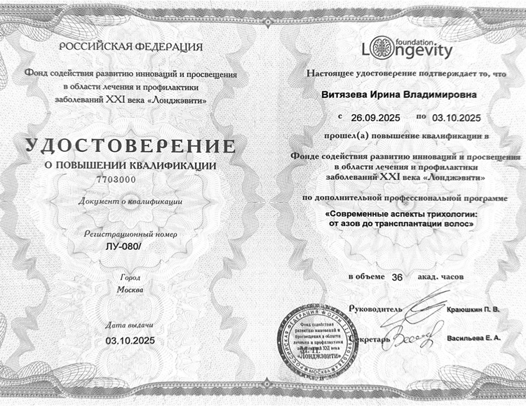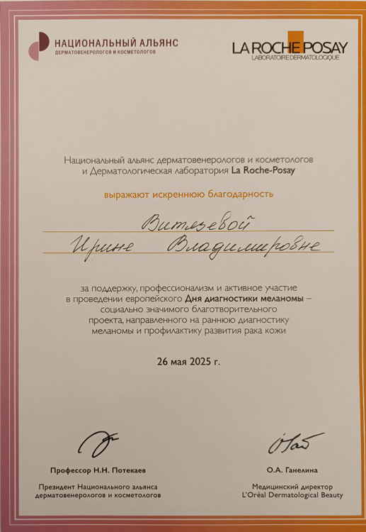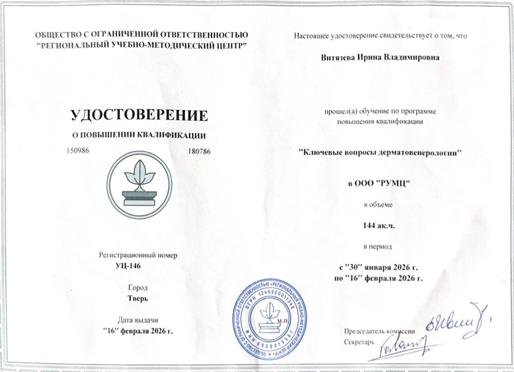 Витязева Ирина Владимировна является специалистом экспертного уровня за счет 29-летнего стажа работы в дерматовенерологии. Разработчик авторских методик лечения с комплексным подходом к первопричине заболевания. Витязева Ирина Владимировна специализируется на лечении сложных пациентов и хронических заболеваний с доказанным длительным результатом излечения. Исправляет неудачи или ошибки в предыдущих лечениях.