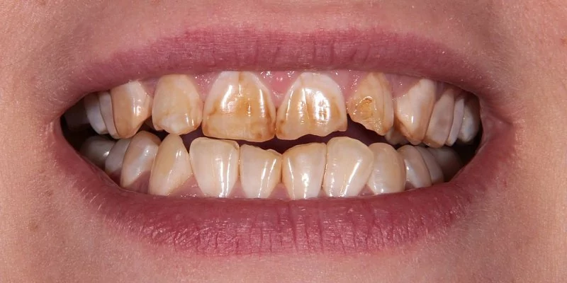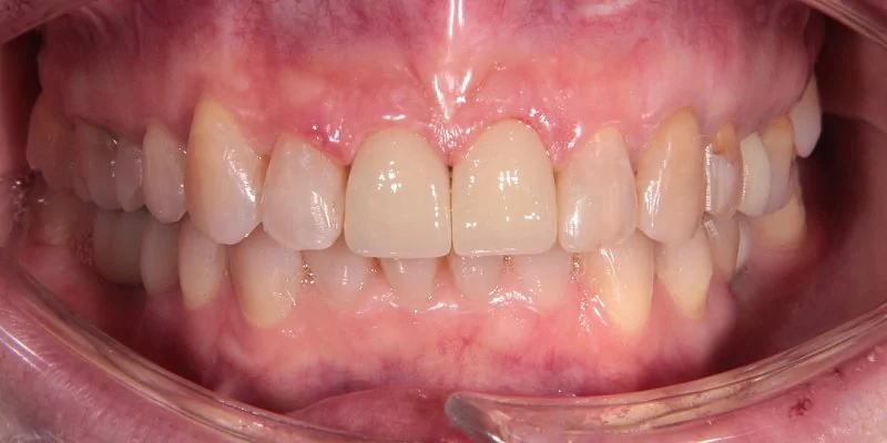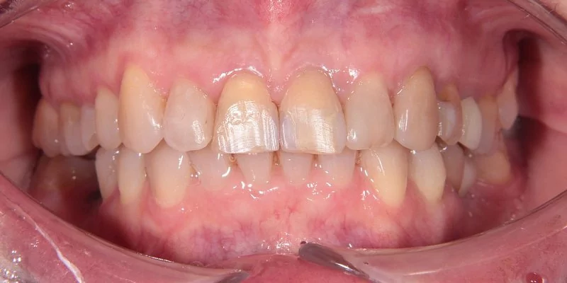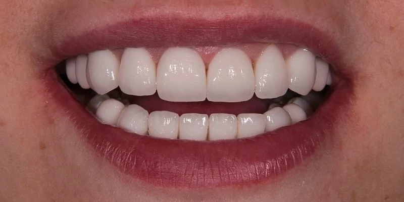 Жалобы на эстетический дефект. установлены керамические виниры без препарирования зубов 1.2, 2.2