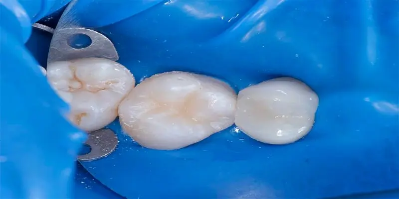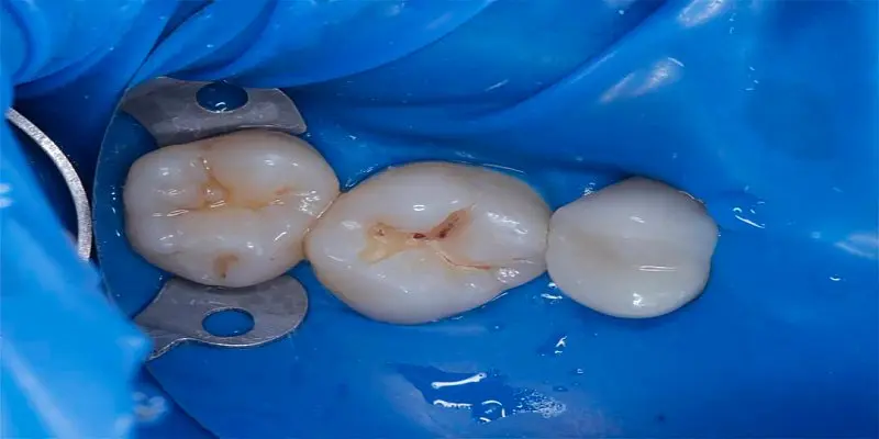 II класс — кариес на контактных поверхностях моляров и премоляров. Поражения этого типа затрагивают боковые поверхности жевательных зубов, что требует более тщательного подхода к лечению и пломбированию, особенно если повреждена контактная зона между зубами.